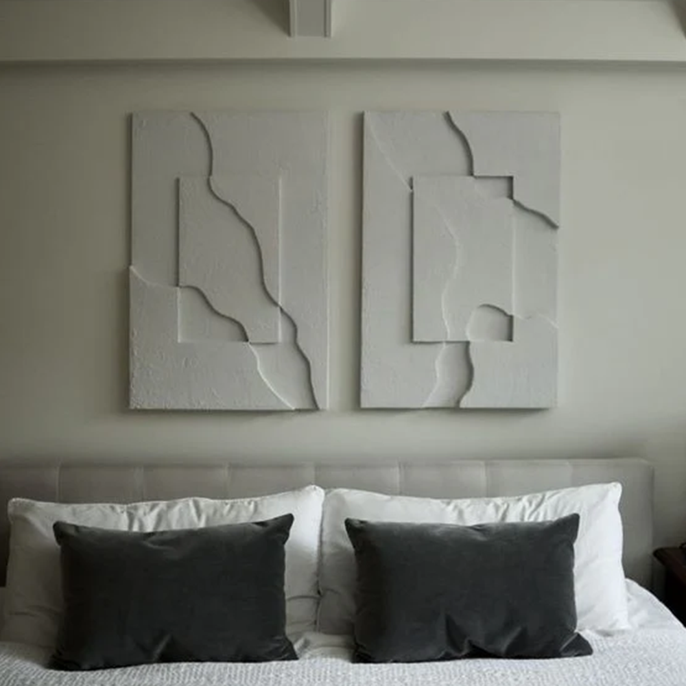 "Fractured Terrain" is a captivating diptych wall art set that explores the interplay of texture, form, and negative space. Each panel features a unique arrangement of raised, geometric shapes with a textured surface, reminiscent of fragmented landscapes or geological formations. The shapes interact with each other across the two panels, creating a sense of visual continuity and inviting viewers to explore the connections between the individual pieces. The raised elements cast subtle shadows that enhance the depth and dimension of the artwork, adding a dynamic element to the composition.