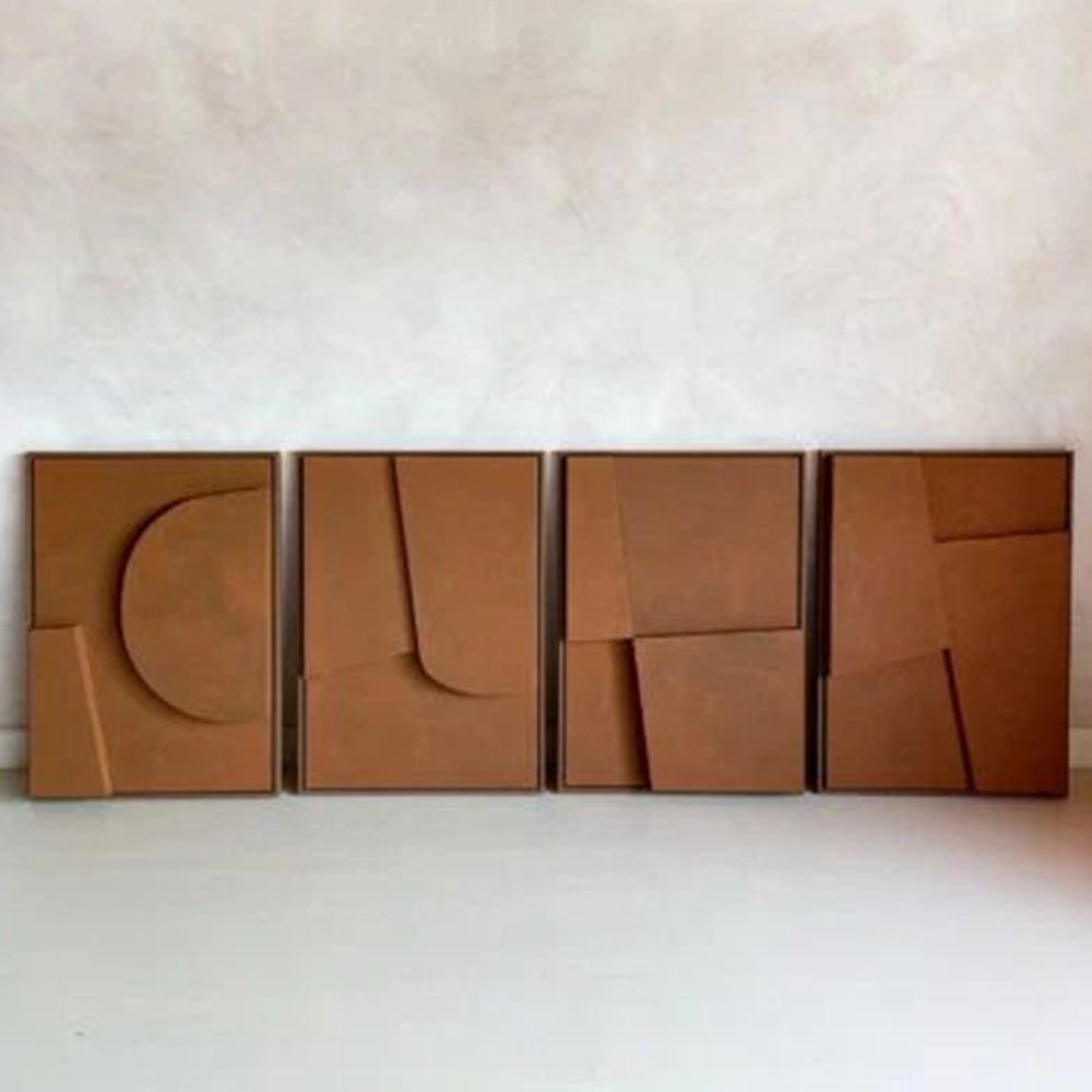 "Tessellated Terrain" is a unique wall art set that explores the interplay of form, texture, and dimension through a minimalist yet impactful lens. Each of the four panels features a distinct arrangement of raised geometric shapes, creating a sense of depth and visual interest. When displayed together, the panels form a larger composition, suggesting fragmented landscapes, abstract cityscapes, or simply a dynamic interplay of forms. The raised elements cast shadows that shift and change depending on the ambient light, adding a captivating layer of dynamism to the artwork. The design is both modern and sophisticated, offering a touch of architectural intrigue to any space. Imagine the shapes as miniature buildings, eroded rock formations, or simply appreciate them as a study in form and shadow. The textured surfaces add another layer of visual interest, inviting the viewer to explore the subtle nuances of the piece.