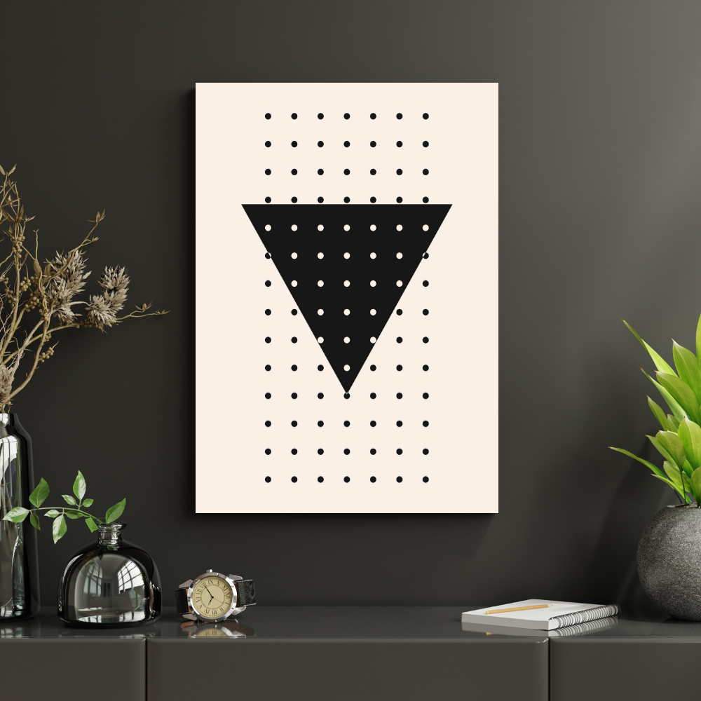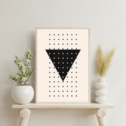"Apex Point" presents a study in geometric minimalism, where a bold triangular form takes center stage against a field of precisely arranged dots. The artwork explores the interplay between solid shape and patterned texture, creating a sense of visual harmony and structured elegance. The clean lines of the triangle offer a strong focal point, while the surrounding grid of dots adds a layer of subtle complexity and visual rhythm. The deliberate arrangement of these elements creates a balanced composition that is both simple and engaging, inviting contemplation of form and spatial relationships. This print is perfect for adding a touch of modern sophistication and understated artistic flair to a living room, bedroom, office, or any space that could benefit from a bit of minimalist décor and geometric intrigue. The artwork's versatile design complements a variety of interior décor styles, particularly those with a modern, contemporary, or Scandinavian vibe.