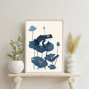 "Lilypad Contemplation" is a captivating canvas print that captures the quiet beauty and serene atmosphere of a tranquil pond. The artwork showcases a stylized frog, depicted with simple lines and subtle details that evoke its gentle nature. The frog is peacefully perched on a lilypad, surrounded by delicate lotus blossoms in various stages of bloom. The composition is both balanced and calming, creating a sense of harmony and tranquility. This piece is perfect for adding a touch of natural inspiration and peaceful contemplation to a living room, bedroom, bathroom, meditation space, or any area that could benefit from a bit of serene beauty. The artwork's versatile aesthetic complements a variety of interior décor styles.