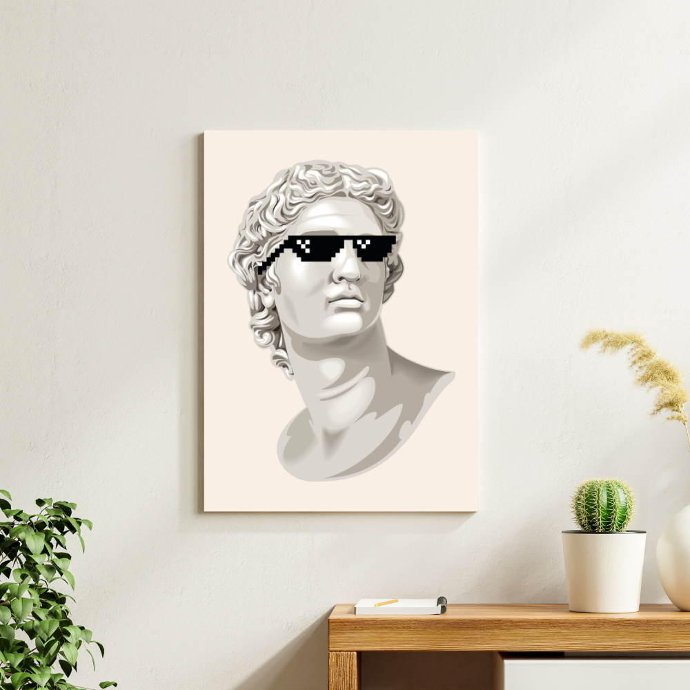 Infuse your space with a captivating blend of timeless artistry and contemporary wit with our Paradox wall art. This compelling piece features a classical bust, rendered with intricate detail that highlights its historical grace and sculptural form. However, a striking modern twist is introduced as pixelated, stylized eyewear is superimposed over the eyes, creating an unexpected and humorous contrast. This design offers a unique commentary on the enduring relevance of classical aesthetics within a playful, modern context, inviting viewers to ponder the convergence of different eras.