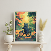 "Whiskered Wheels" is a delightful pixel art print that captures a scene of pure, unadulterated whimsy. The artwork features a fluffy, expressive cat, rendered in a charming pixel art style, confidently riding a bicycle through a stylized, possibly autumnal, landscape. The pixelated aesthetic evokes a sense of nostalgia and playful retro charm, while the cat's determined expression adds a touch of endearing personality. The composition is thoughtfully arranged, with the cat and bicycle positioned as the central focus, creating a visually engaging and lighthearted scene. This piece is perfect for adding a touch of playful personality to a living room, bedroom, children's room, or any space that could benefit from a bit of whimsical visual interest. The artwork's unique aesthetic complements a variety of interior décor styles, particularly those with a retro, eclectic, or playful vibe.