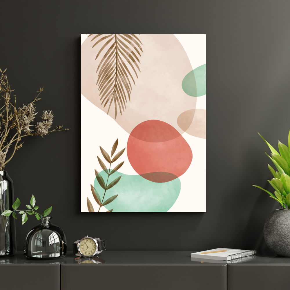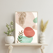 "Whispering Leaves" presents a gentle exploration of botanical forms through abstract and layered shapes. The artwork features stylized depictions of leaves and organic forms, creating a serene and naturalistic composition. The artist's use of overlapping elements and subtle textures evokes a sense of depth and visual softness, inviting contemplation of the delicate balance within the design. The interplay between the botanical motifs and the abstract shapes creates a harmonious and understated aesthetic, making it a versatile addition to various interior styles. This print is perfect for adding a touch of contemporary sophistication and quiet artistic flair to a living room, bedroom, study, or any space that could benefit from a bit of nature-inspired décor and tranquil design. The artwork's balanced design complements a variety of interior décor styles, particularly those with a modern, bohemian, or Scandinavian vibe.
